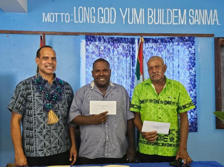 The Minister for Climate Change and Energy, Ralph Regenvanu, handed over to the SANMA Provincial Government Council (SPGC) and to the Luganville Municipal Council (LMC) the long-awaited dividends from their share of the concession fee of 2% of the gross annual revenue earned by the Vanuatu Utilities Infrastructure (VUI) from its management of the Santo electricity concession on Friday 23rd May, at the SANMA Provincial Government headquarters in Luganville.