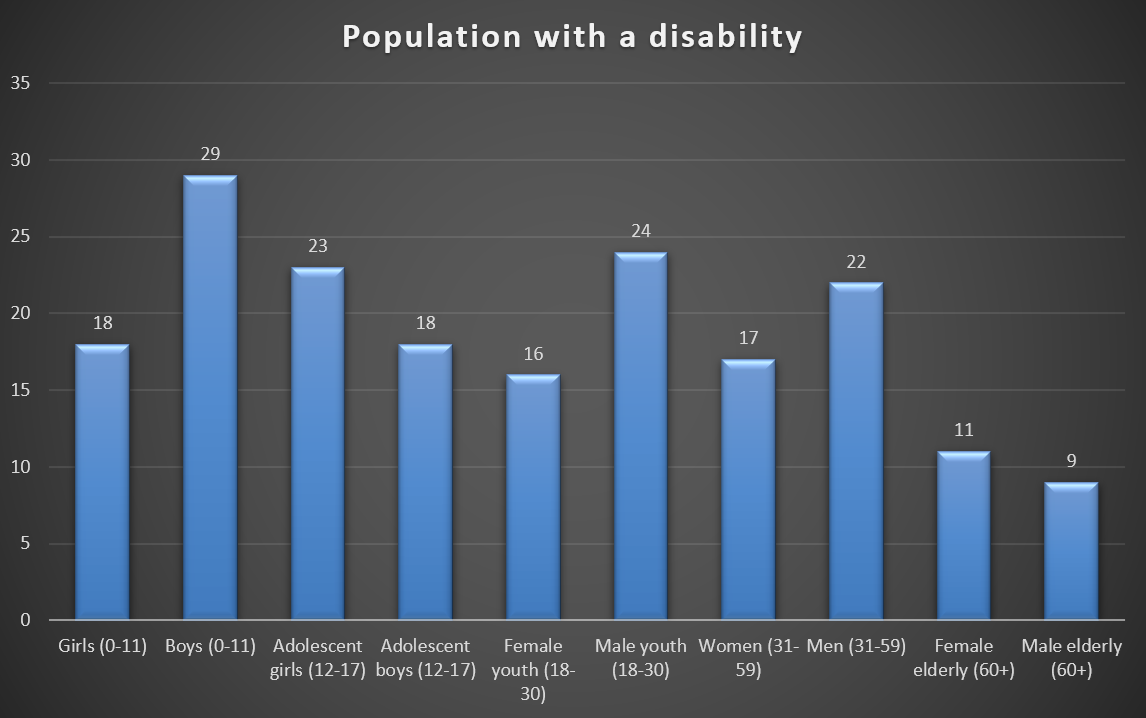 - Disability among youth and adults are equally 21% while disability among the elderly stands at 11%. As the population ages, there will be more adults and elderly people with disabilities.